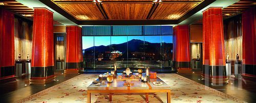 大堂才是Jean Michel Gathy最完美的杰作。一幕巨大的落地玻璃窗將拉薩的城景定格,拉薩城、喜瑪拉雅山及周邊的壯麗景色在眼前鋪展開來(lái),而焦點(diǎn)自然是遠(yuǎn)處的布達(dá)拉宮。在酒店內(nèi),150間套房、12棟別墅和一間總統(tǒng)套房,幾乎所有房間,都能輕易看見布達(dá)拉宮,最美妙的自然是總統(tǒng)套房,那巨大的圓形浴缸,洗浴間的窗口正對(duì)著那美得讓你目不轉(zhuǎn)睛的宮殿。