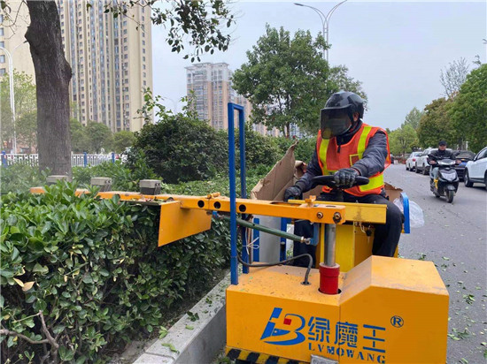 4月13日,周口大道上園林工人操作著特殊的園林作業(yè)車,修剪路邊的綠化樹,使用“電推子”,不僅提高了效率、節(jié)省了人力,就連“剃”出來的“平頭”也更平了?!半娡谱印彼街帲G化樹被修剪得很齊整。②9